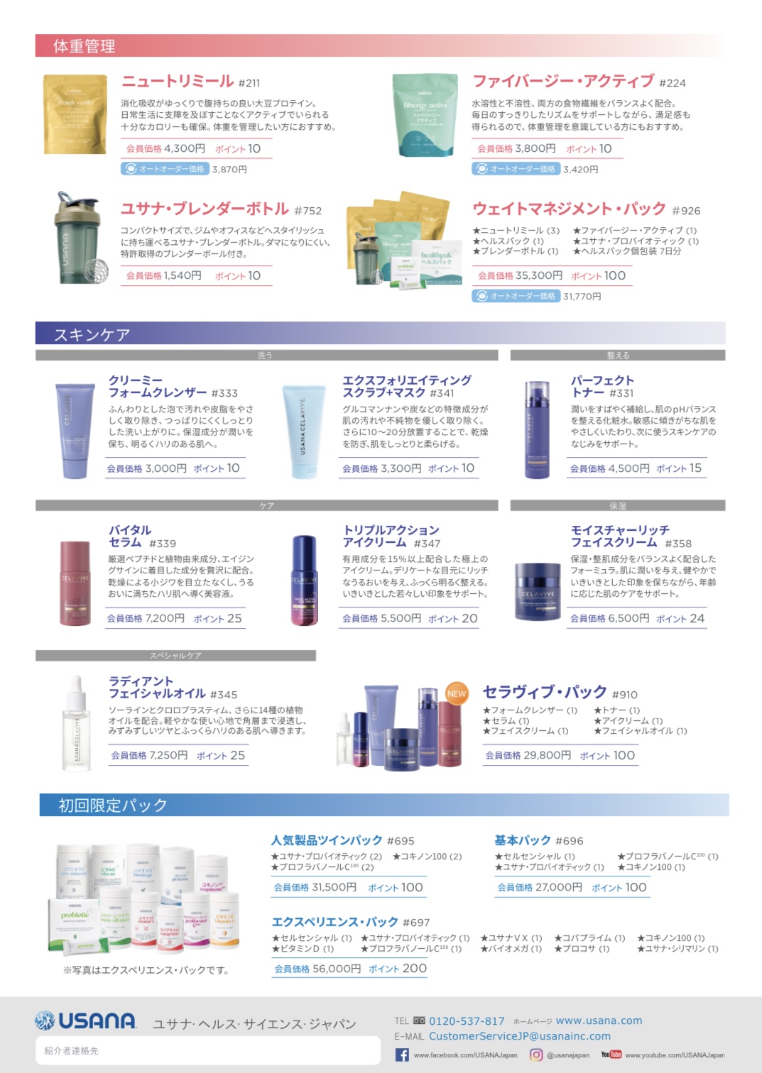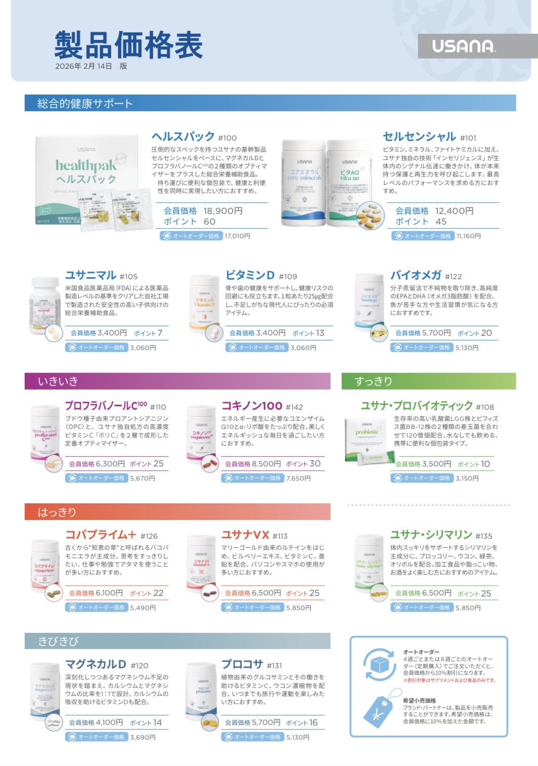 【重要:2026年2月14日より】製品価格変更について 2026.02.14 @真の健康100万人プロジェクト®事務局 いつもユサナ製品をご愛用頂きありがとうございます。 【重要】2026年2月14日より製品価格変更のお知らせ 原材料価格、輸送費用が著しく高騰しております。さらにアメリカ本社で製品製造に関わる人件費や昨今の円安傾向など、今後も厳しい状況が続く見込みとなっております。 誠に不本意ではございますが、製品価格変更を実施させていただくこととなりました。 ◉実施日:2026年2月14日 2月14日以降の新価格をお知らせ致します。 どうぞ、こちらをご覧ください。 https://www.usana.com/static/images/jp/Business/Forms/Pricelist-JP-JP.pdf ================ 上記について、ご不明な点は、USANAカスタマーサービスまでお願いいたします。 ユサナ・ヘルス・サイエンス・ジャパン 0120-537-817 平日10時~18時 いつもありがとうございます。